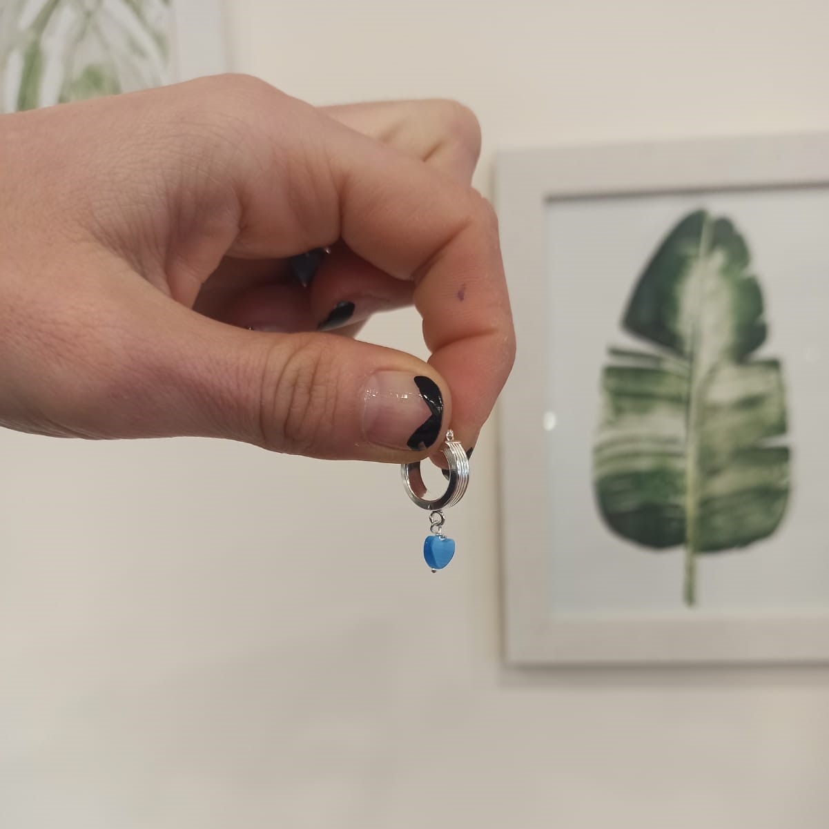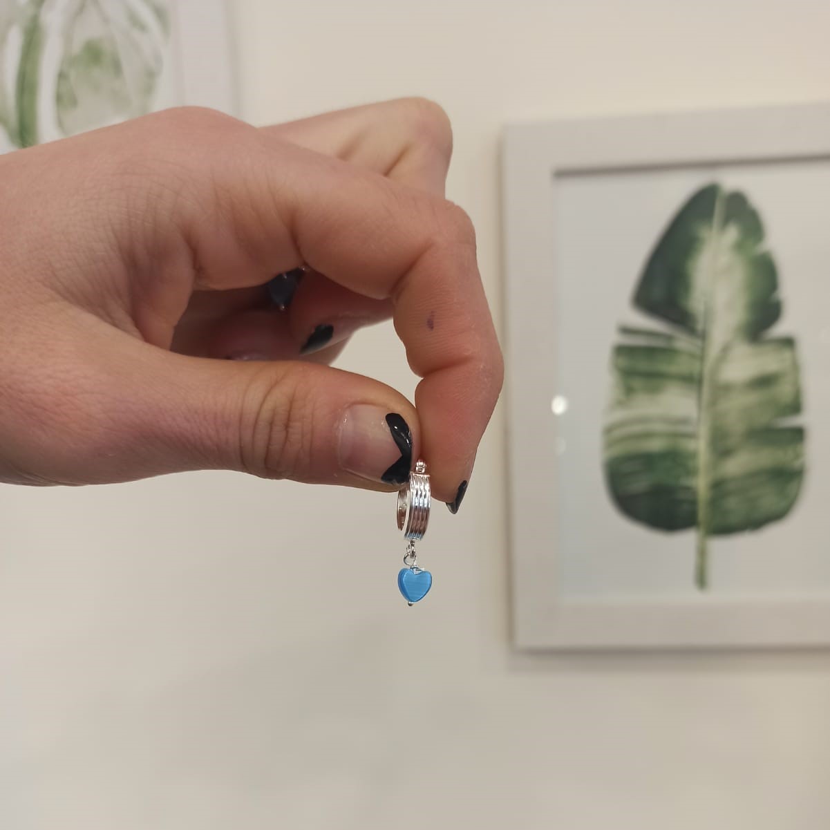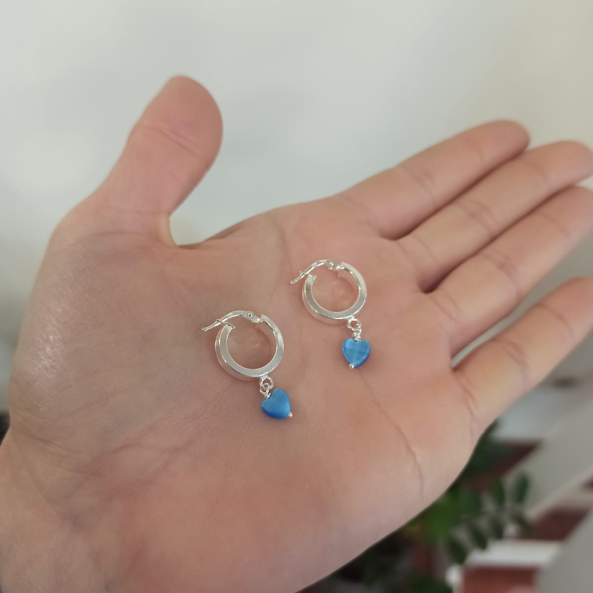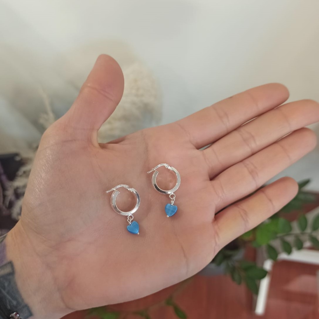 Estas argollas de plata de ley 925 destacan por su diseño elegante y moderno, acompañadas de un delicado colgante en forma de corazón azul de resina. Son ligeras, cómodas y perfectas para darle a tu look un aire romántico, juvenil y colorido. Ideales para el uso diario o para regalar a alguien especial.