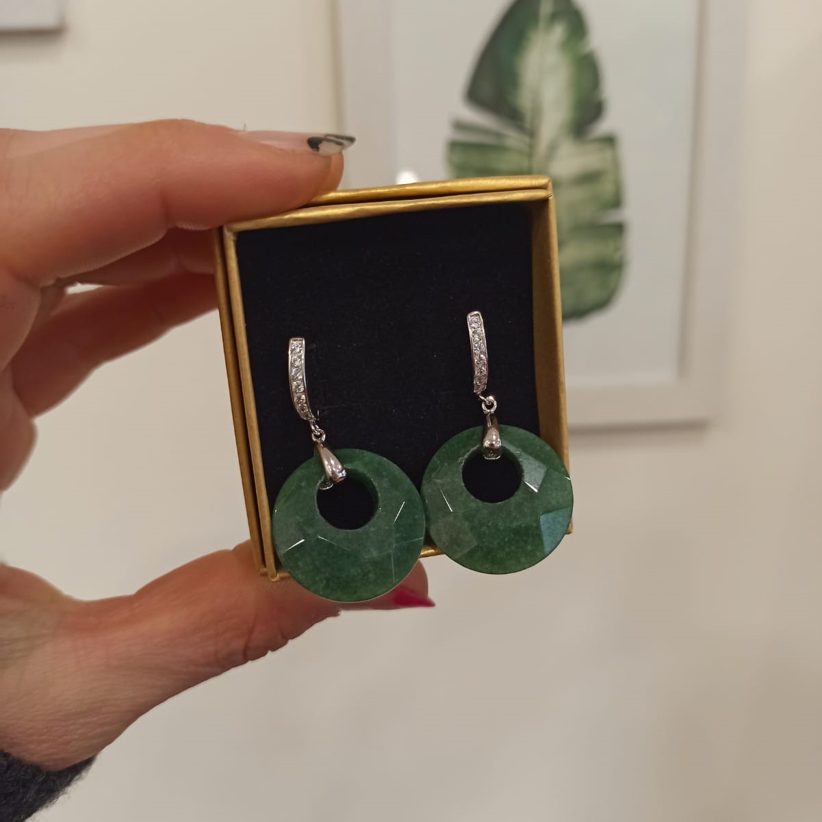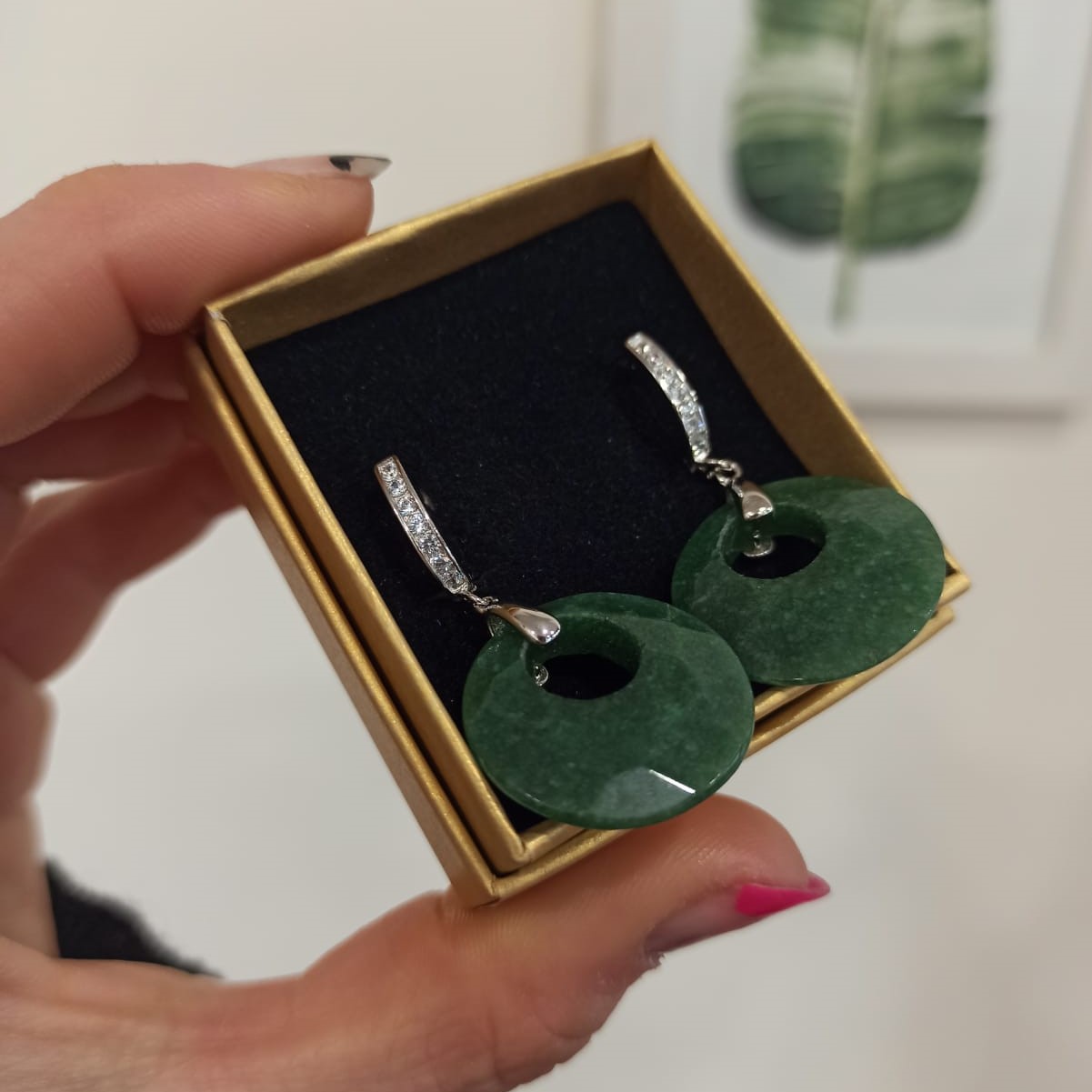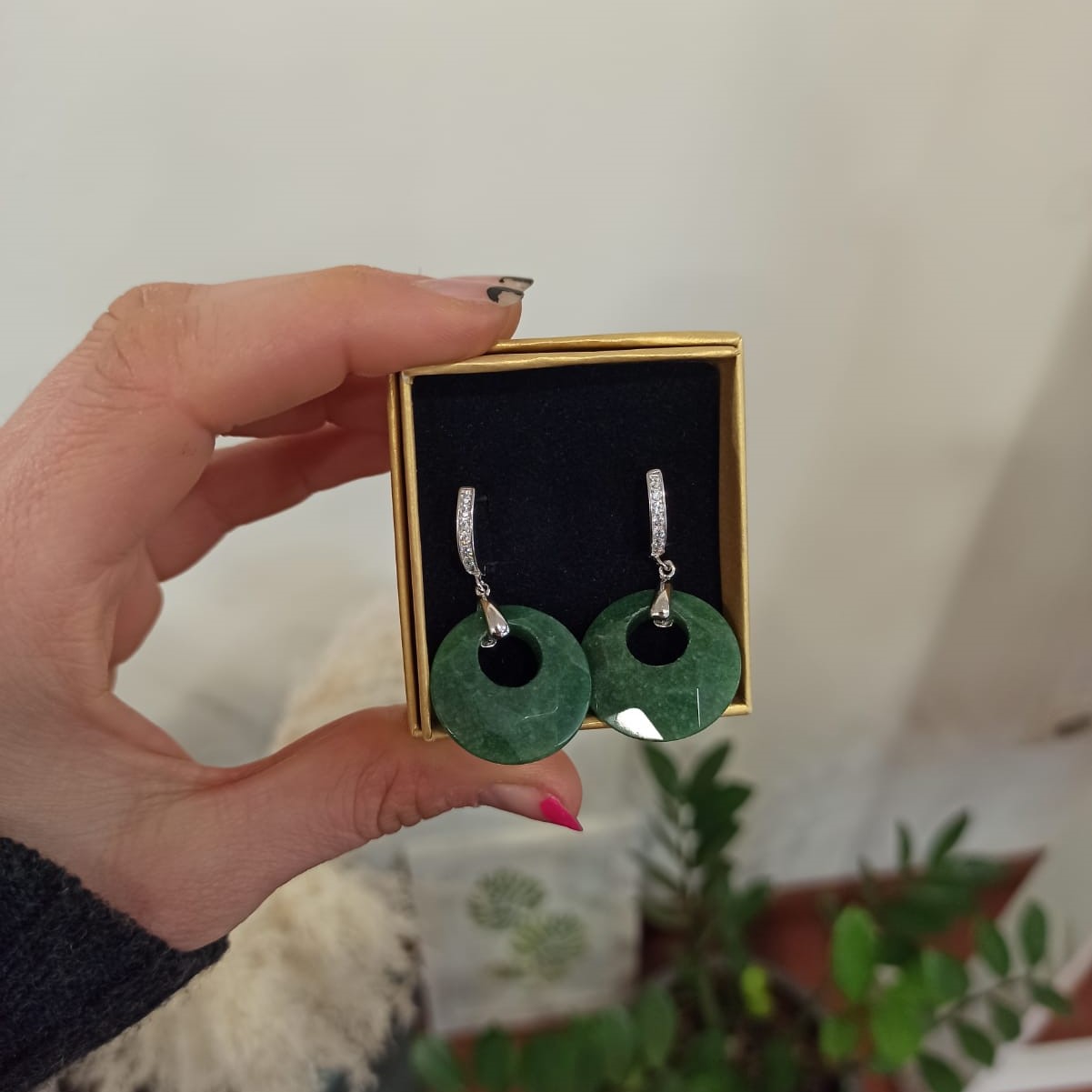 Esta joya fusiona el estilo contemporáneo con la espiritualidad de las piedras naturales. La piedra verde es conocida por simbolizar la esperanza, la abundancia y la armonía, lo que convierte a estos aros en una elección ideal para quienes buscan belleza con significado.