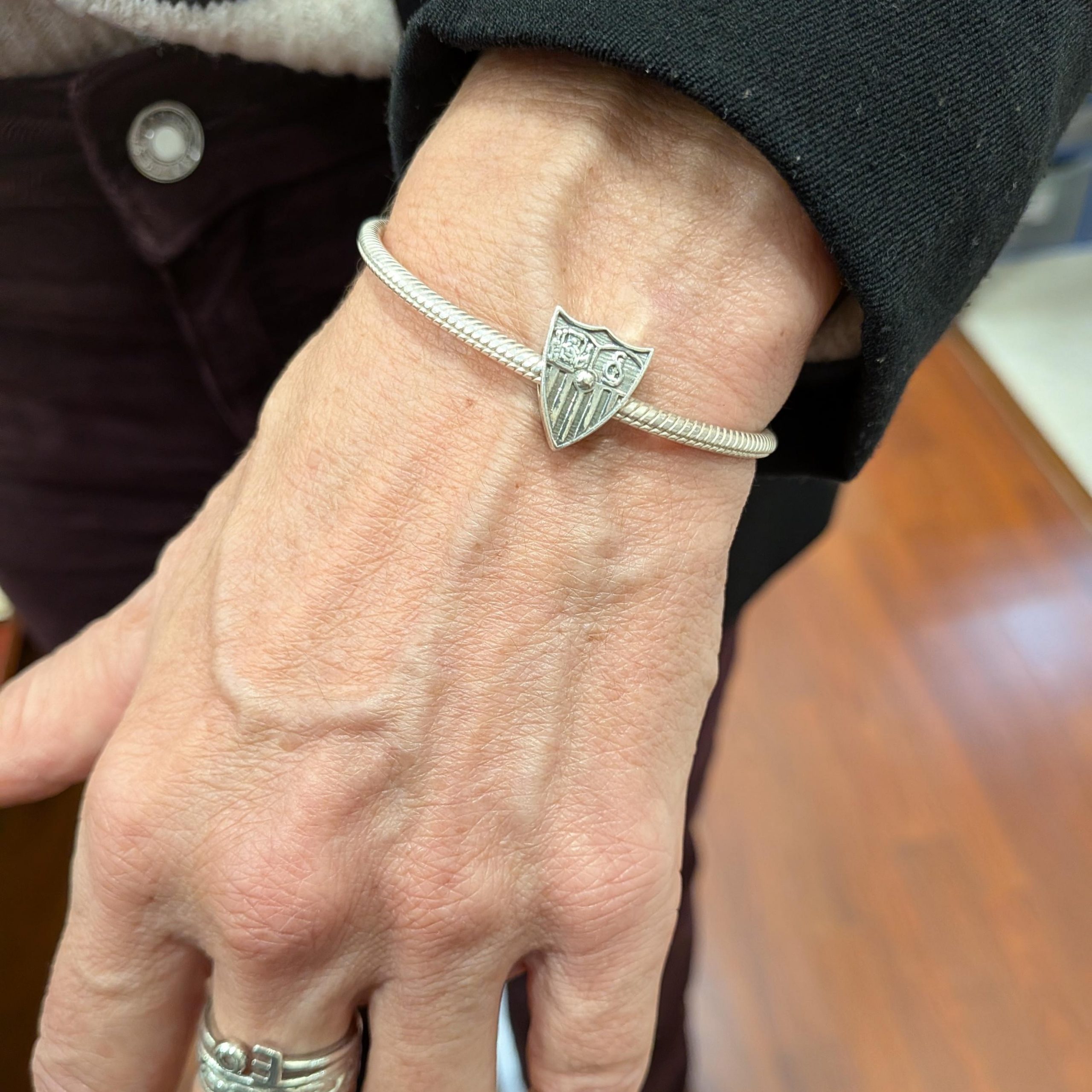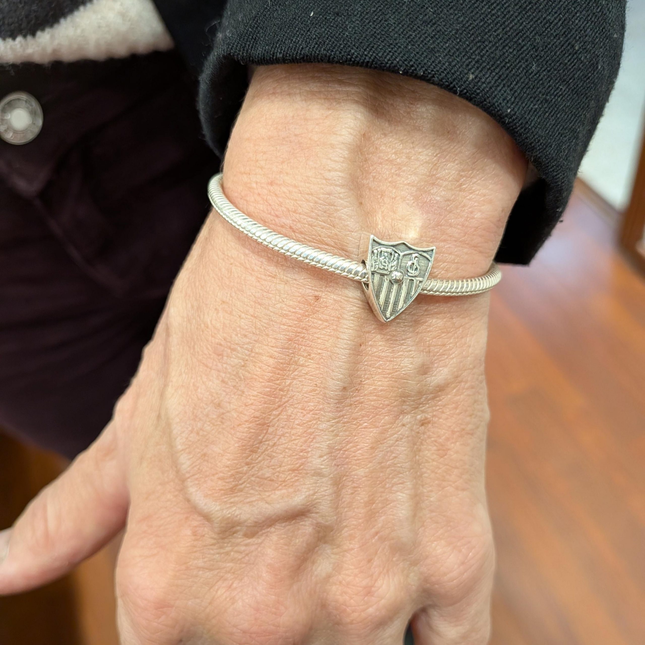 Lleva contigo el escudo del Sevilla Fútbol Club con este elegante charm de plata 925, diseñado completamente sin esmalte, ideal para quienes prefieren una pieza discreta y metálica.