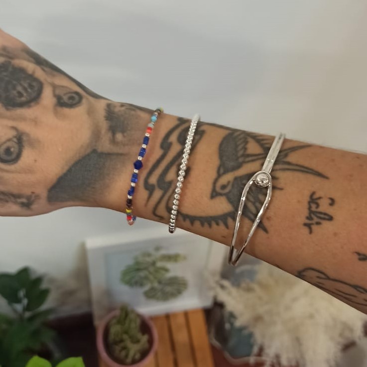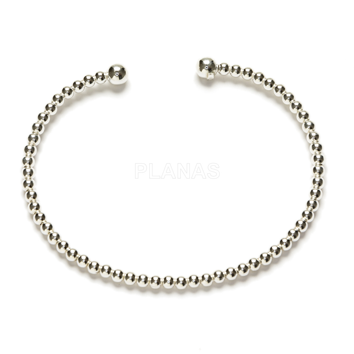 Fabricada en plata de ley 925, esta pulsera presenta un acabado pulido de alto brillo y una estructura sólida pero ligera. Con un diámetro de 60 mm y esferas de 3 y 5 mm, se adapta cómodamente a la muñeca, aportando un toque sofisticado a cualquier look.